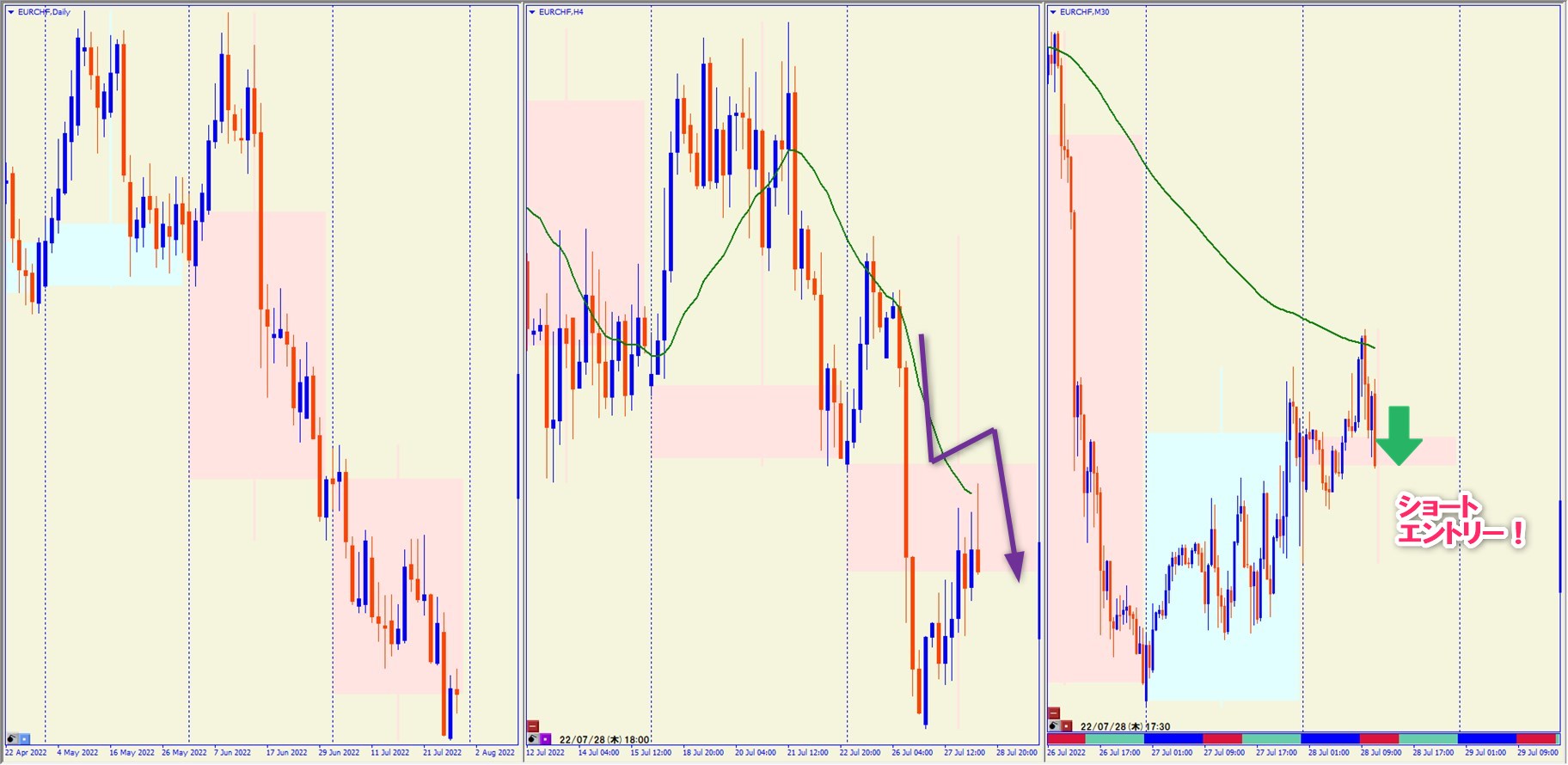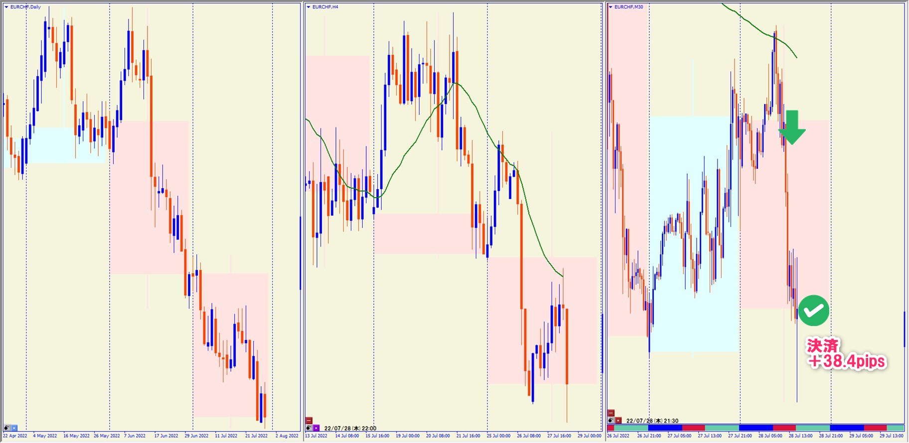 2022.7.28 17:30 EURCHF ショート +38.4pips