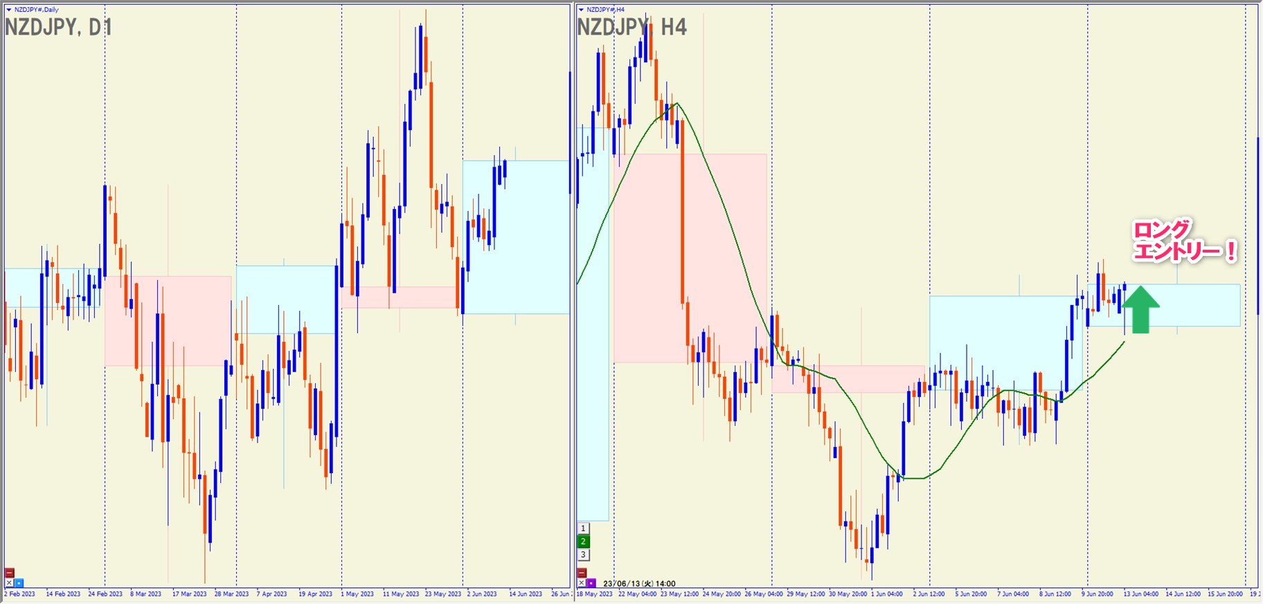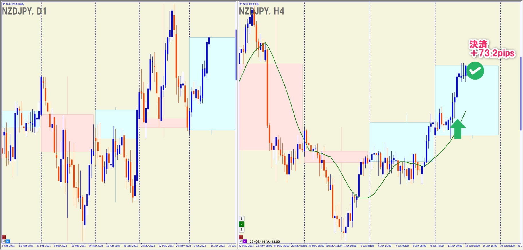 2023.6.13(火)14:00 NZDJPY ロング +73.2pips