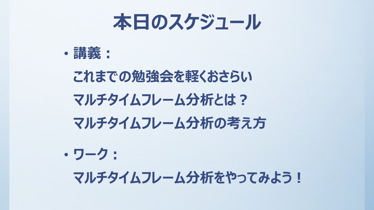 その流れを踏まえた上で、今回の勉強会テーマを「マルチタイムフレーム分析」と題し