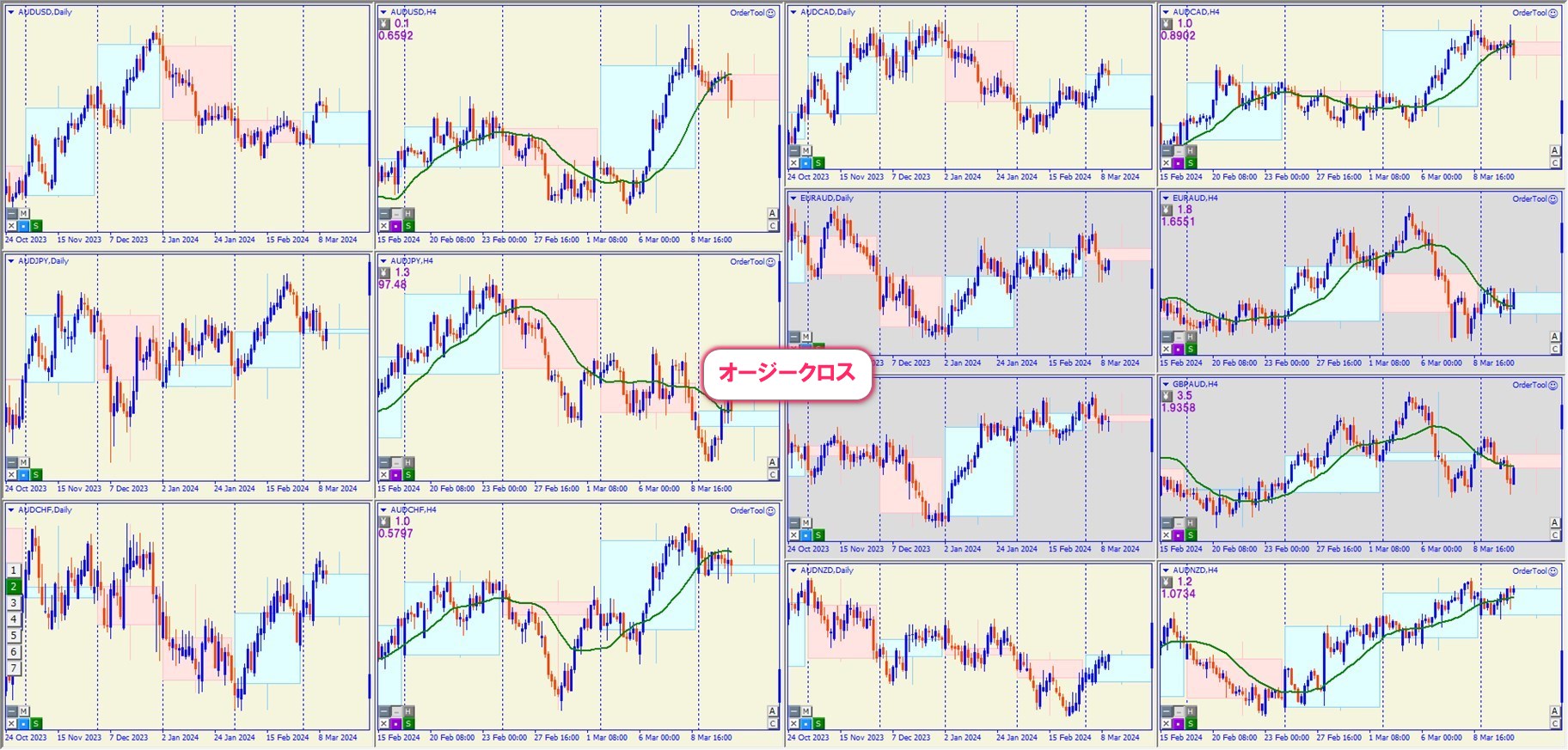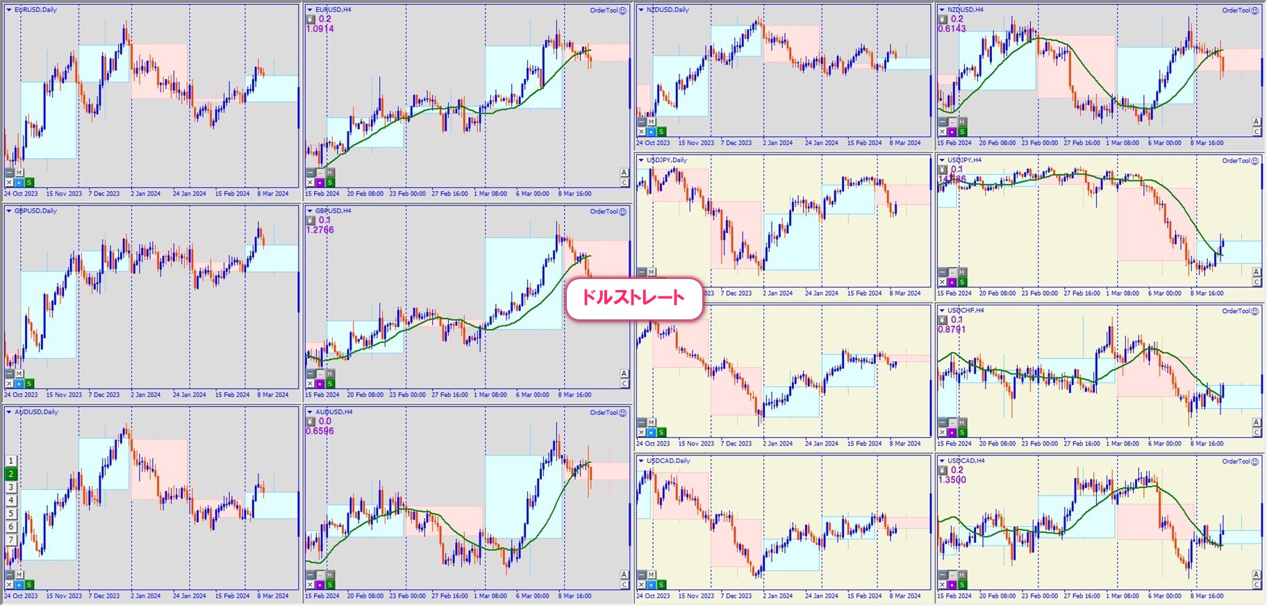 それぞれの日足・4時間足チャートをメインに表示させて相場全体を観察しています