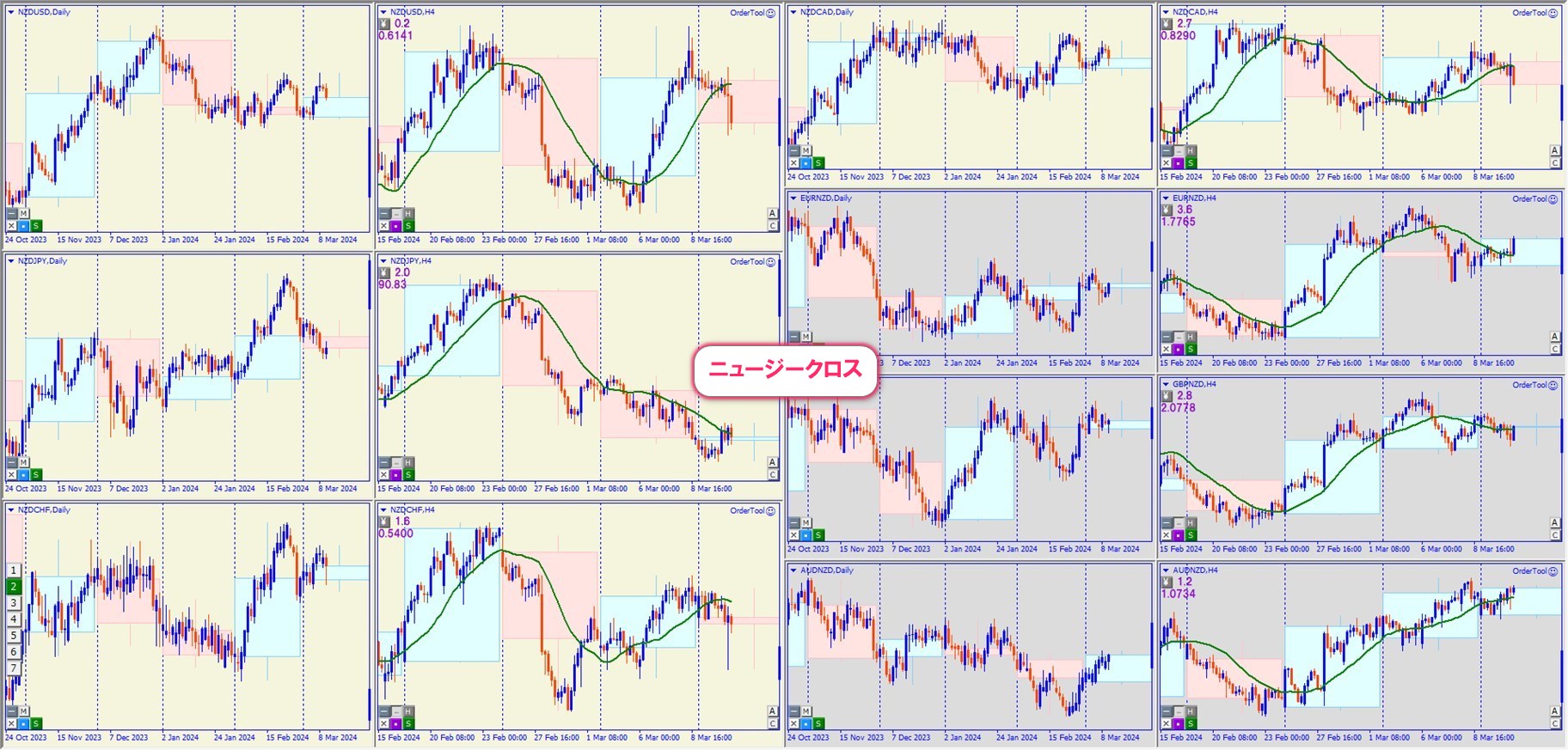 外出先では、ノートPC1画面にこれらの並びのMT4をそれぞれ立ち上げ