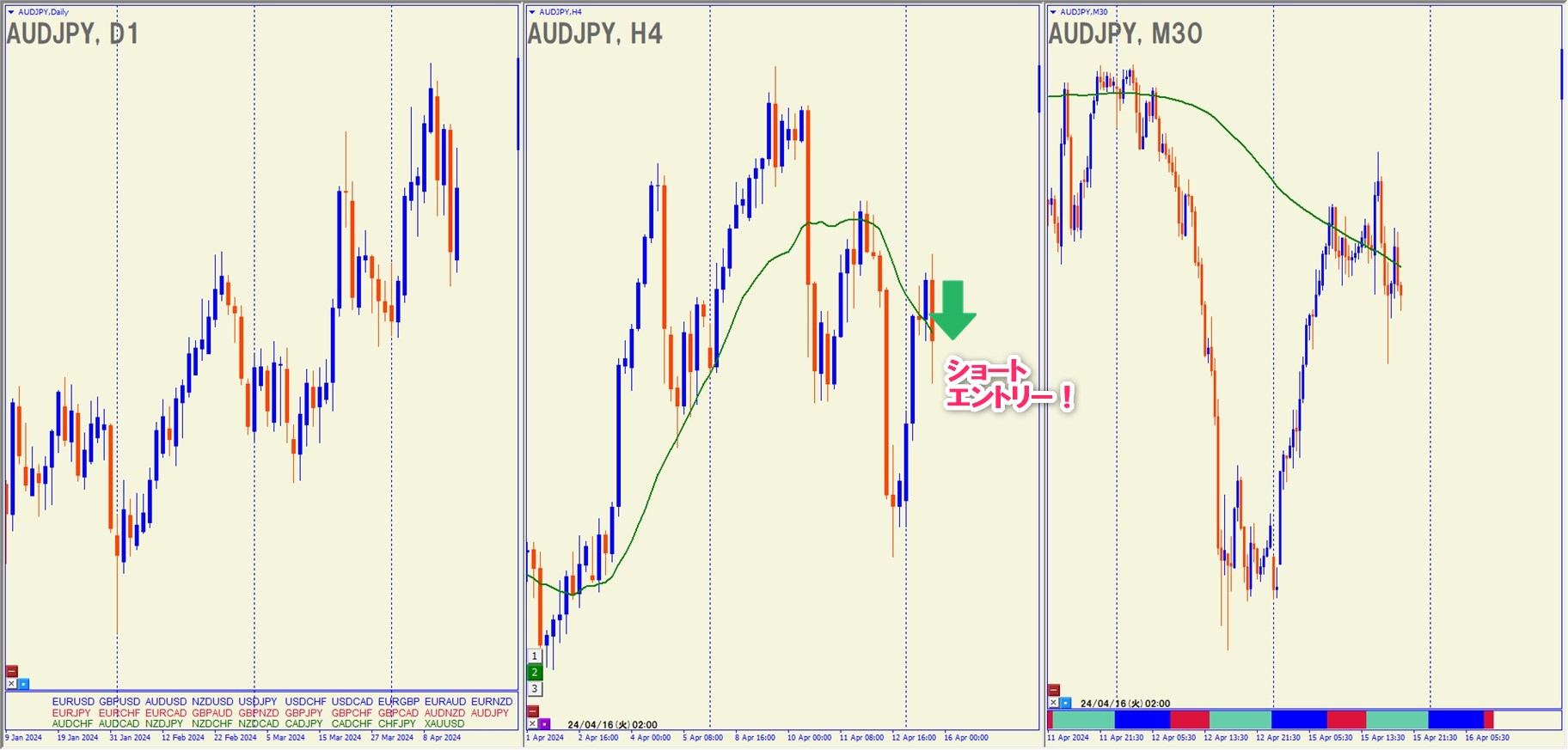 同じく日付が変わって午前2時の4時間足確定判断でのAUDJPYと同じタイミングでのトレードです
