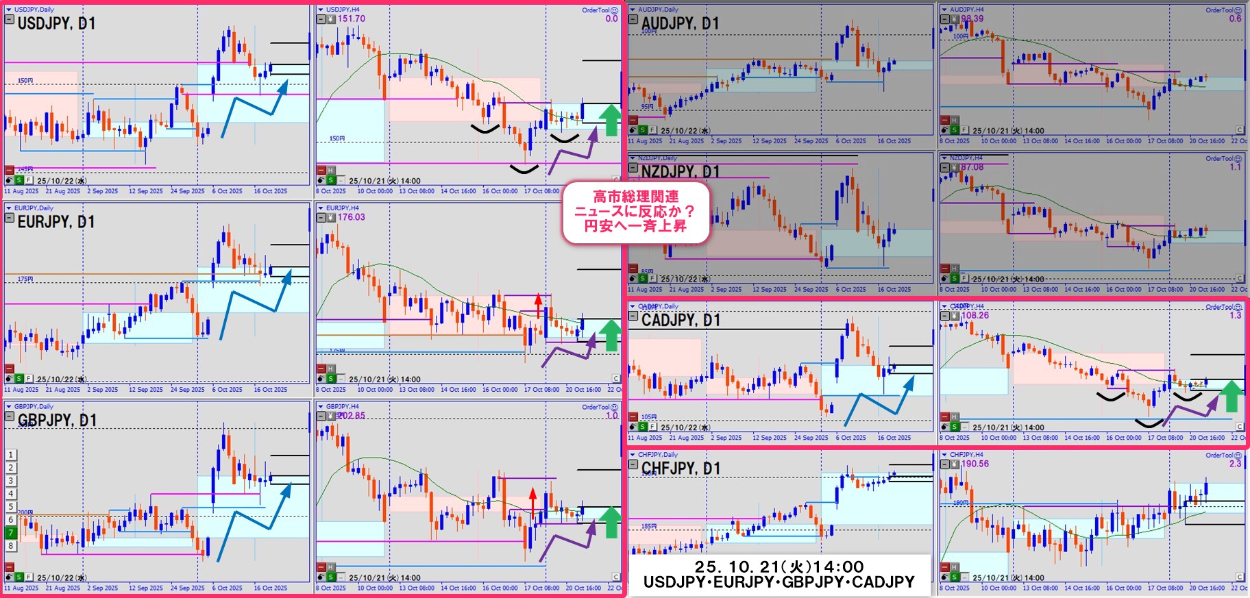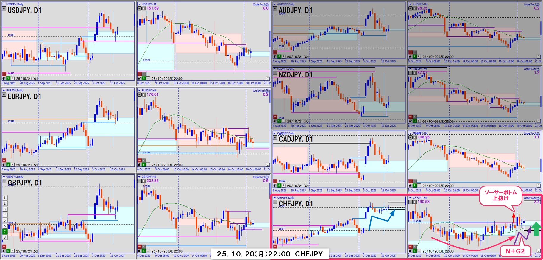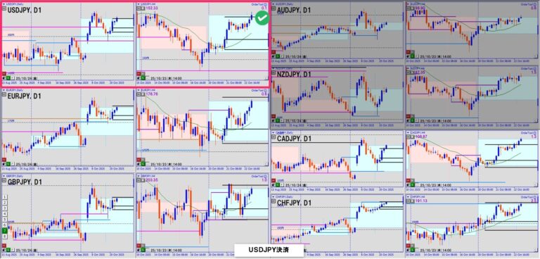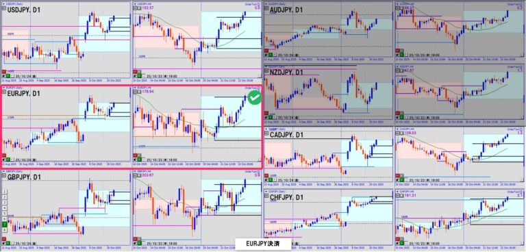すべてのチャートで上昇波再開を確認し、4通貨ペアを同時にロングエントリー。