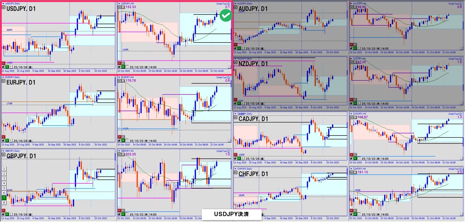 すべてのチャートで上昇波再開を確認し、4通貨ペアを同時にロングエントリー。