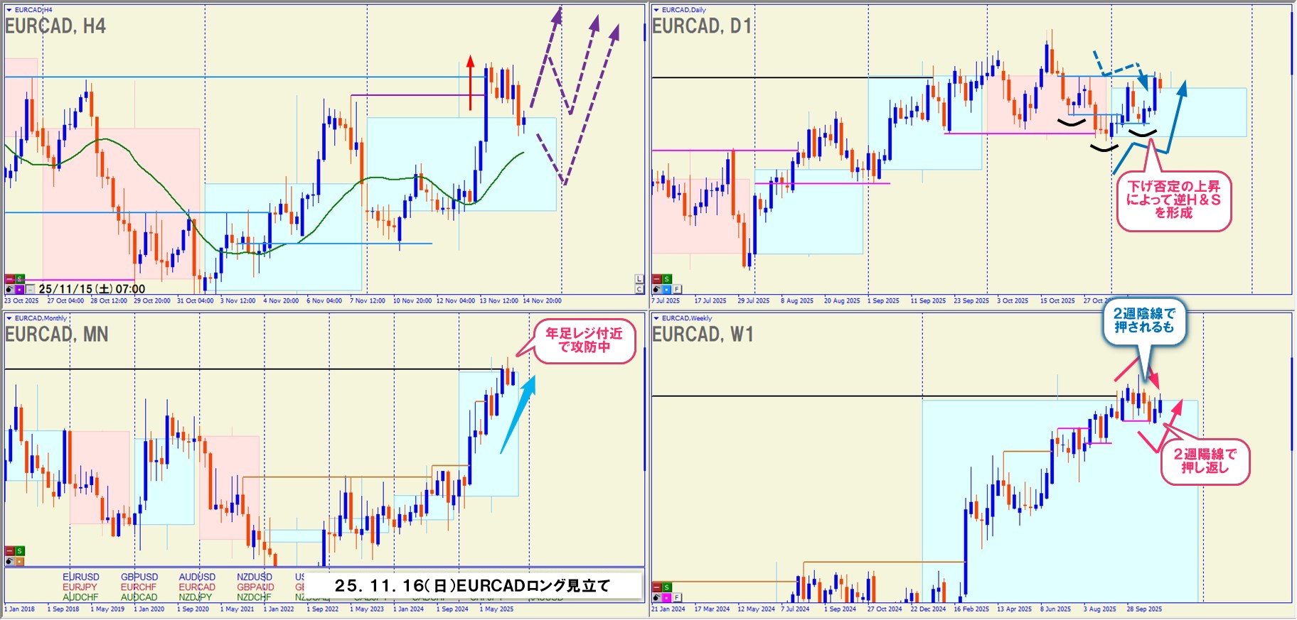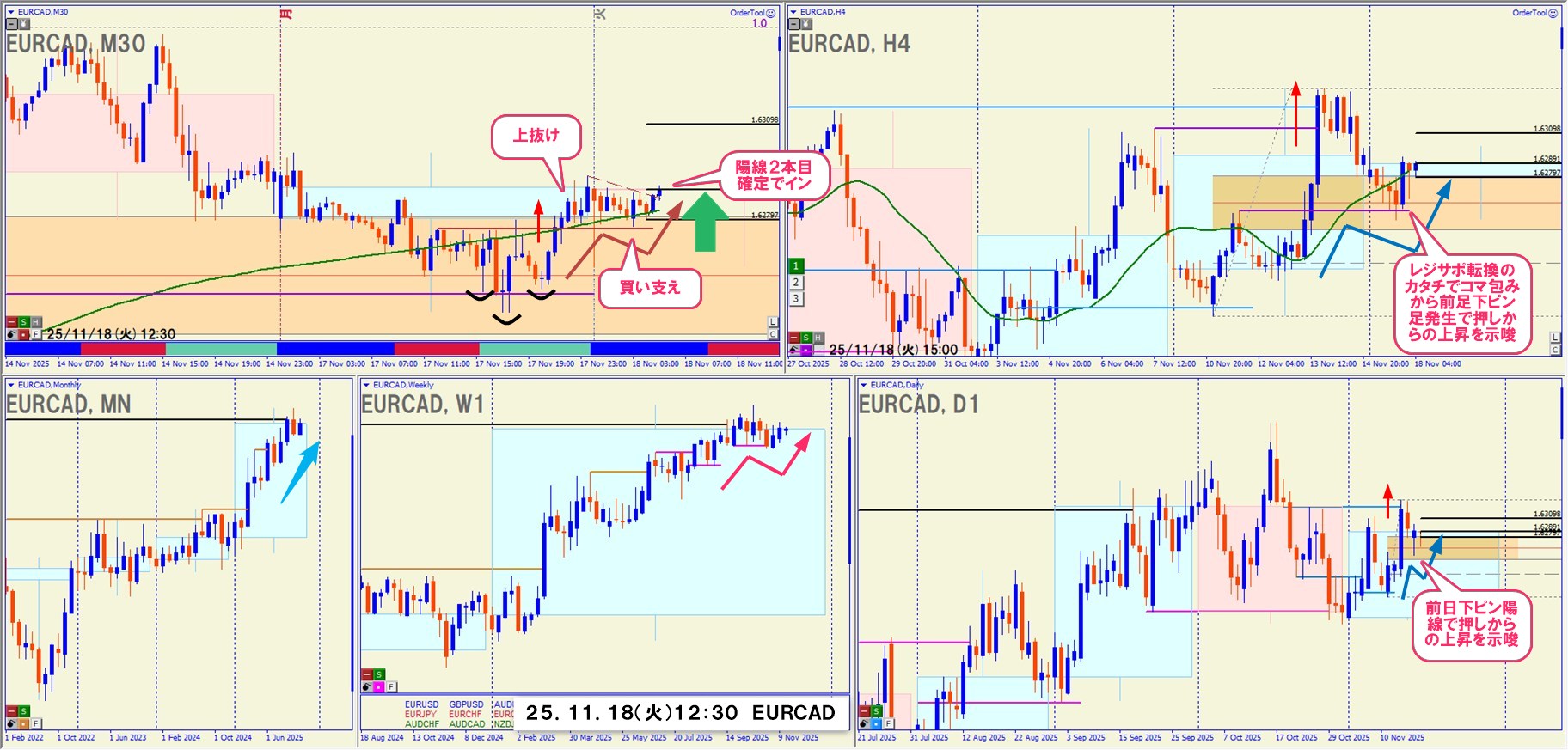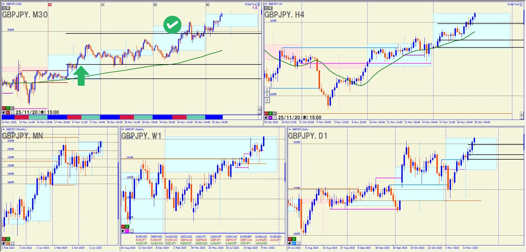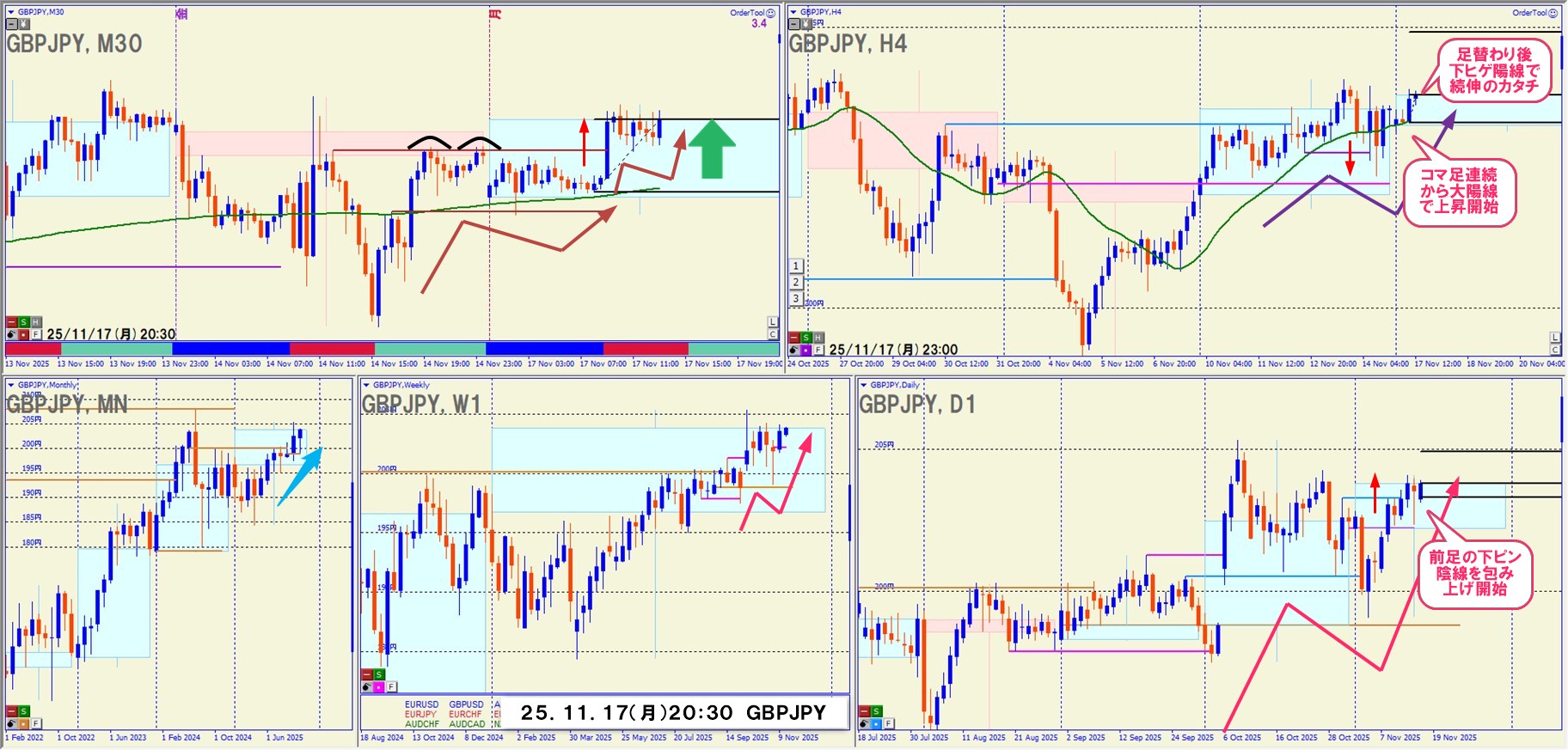 上位足 → 中位足 → 短期足 の階層で環境認識が整っていたときは、順張り押し目買いが非常に強い。